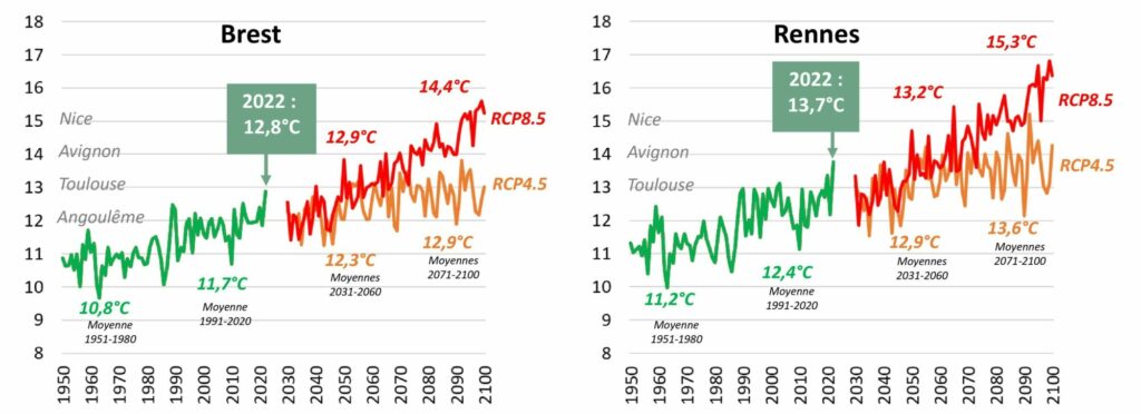 L’année 2022 se classe ainsi, en termes de température annuelle à Rennes comme à Brest, au niveau de ce que sera la moyenne en fin de siècle pour le scénario intermédiaire (RCP4.5) du 6e rapport du GIEC. Cette valeur 2022 serait donc dépassée à peu près un an sur trois ou quatre en milieu de XXIe siècle et une année sur deux en fin de siècle ; la température moyenne annuelle aura alors augmenté de 2 à 3 degrés par rapport aux « normales » des années 1951-1980 (figure 2). Dans le scénario le plus pessimiste (RCP8.5), cette valeur de 2022 serait systématiquement dépassée en fin de siècle et la moyenne annuelle s’établirait à plus de 4°C au-dessus de celles de l’après-guerre ! On peut ainsi caractériser l’année 2022 comme ce qui sera une année moyenne en milieu de XXIe siècle mais qui sera, en fin de siècle dans un scénario pessimiste, comme le souvenir d’une année… fraîche !