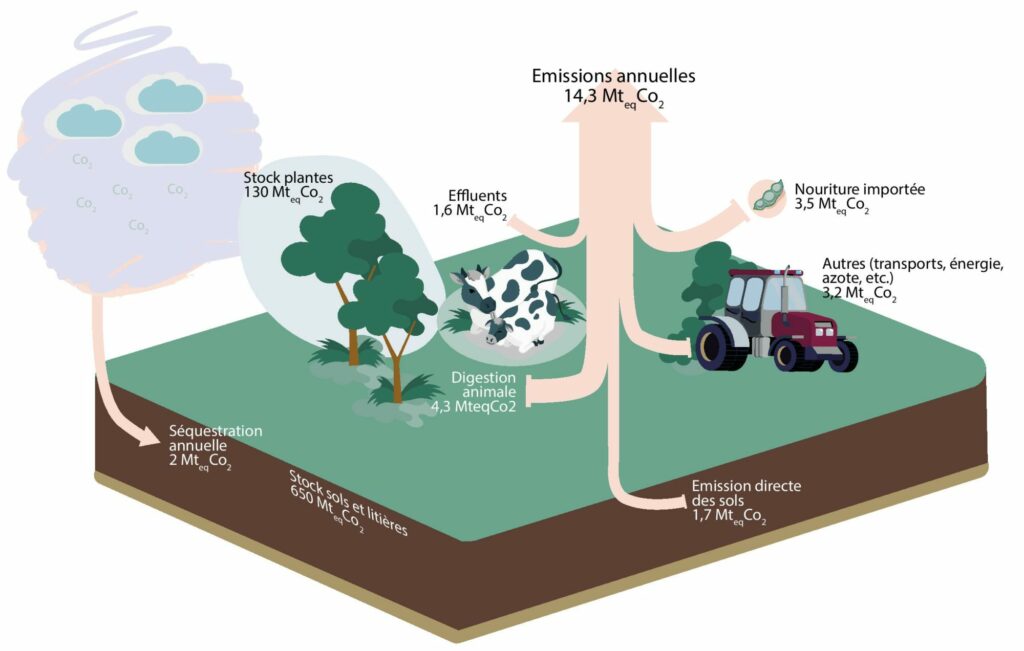 Figure 1 : Bilan des stocks et flux de carbone en équivalent CO2 liés à l’agriculture bretonne (source des chiffres : Ceresco & Solagro, 2023). Ces chiffres sont représentatifs des années 2010-2016. Dans les années récentes, les émissions ont baissé mais la séquestration a diminué également (les estimations plus récentes de l’Observatoire de l’Environnement en Bretagne étant de 1 MteqCO2). Réalisation HCBC.